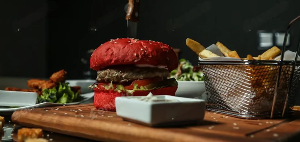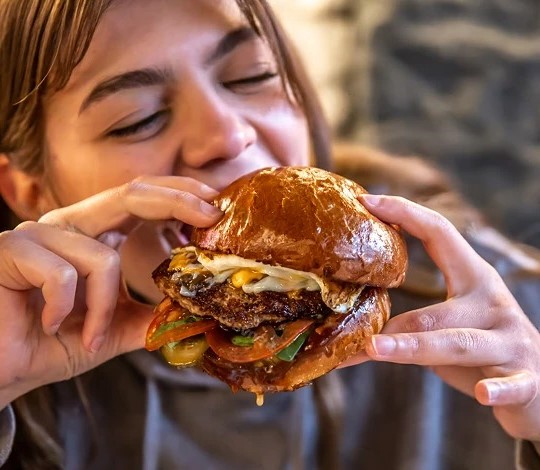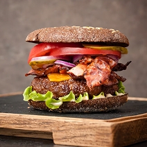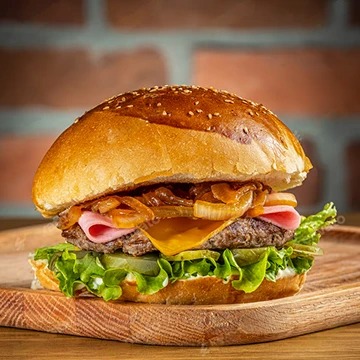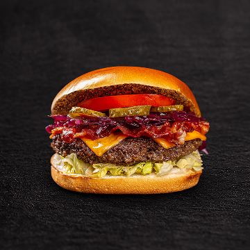 گوشت گاو آبدار، کاهوی تازه، چدار، و سس امضا.