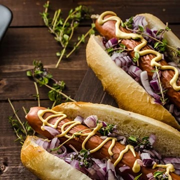 سوسیس کبابی، پیاز کاراملی و سس BBQ دودی.
