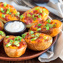 سیب زمینی سرخ شده طلایی با چدار ذوب شده و بیکن ترد.