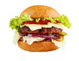 گوشت گاو آبدار، کاهوی تازه، چدار، و سس امضا.